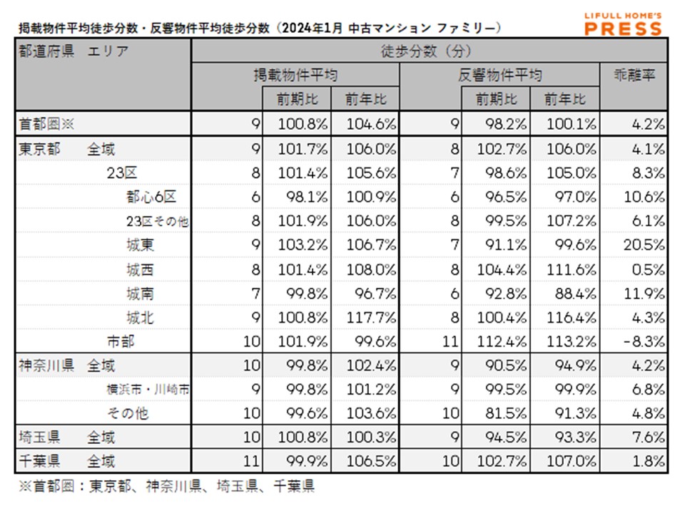 2024年1月の首都圏ファミリー向き中古マンションの掲載物件平均徒歩分数および反響物件平均徒歩分数は以下の通り。