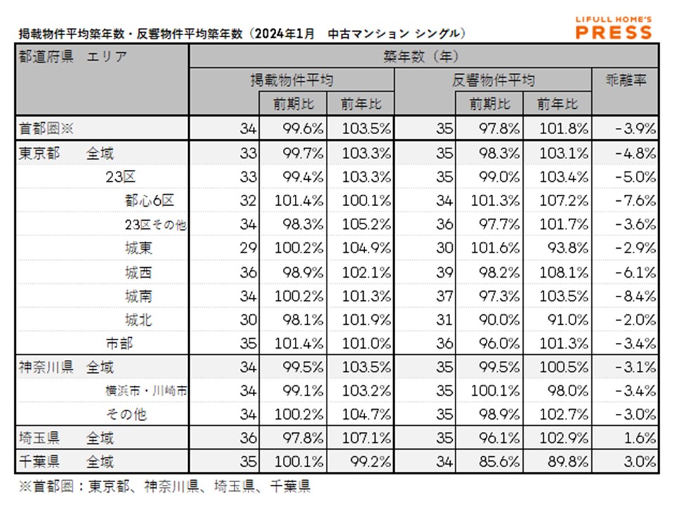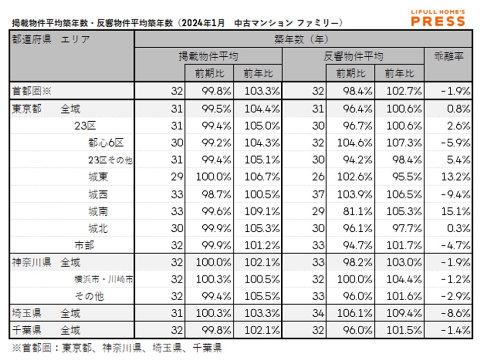 2024年1月の首都圏ファミリー向き中古マンションの掲載物件平均築年数および反響物件平均築年数は以下の通り。