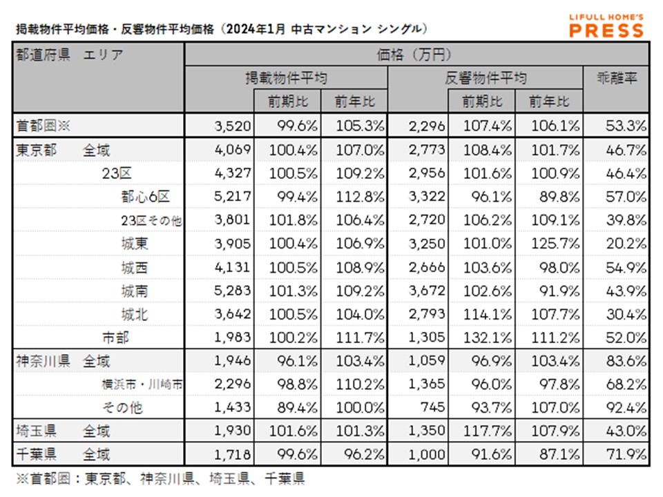 2024年1月の首都圏シングル向き中古マンションの掲載物件平均価格および反響物件平均価格は以下の通り。