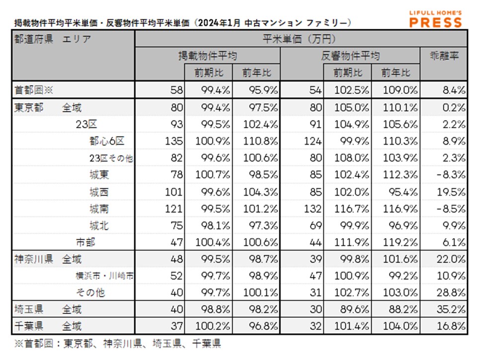 2024年1月の首都圏ファミリー向き中古マンションの掲載物件平均価格および反響物件平均価格は以下の通り。