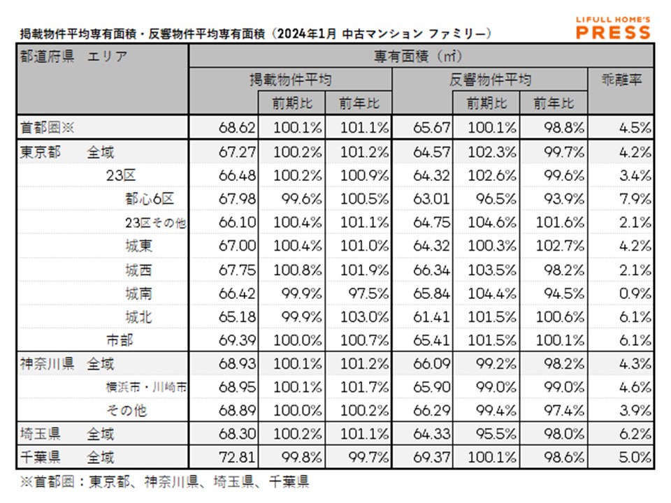 2024年1月の首都圏ファミリー向き中古マンションの掲載物件平均専有面積および反響物件平均専有面積は以下の通り。
