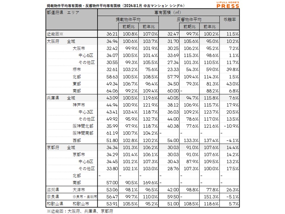 2024年1月の近畿圏シングル向き中古マンションの掲載物件平均専有面積および反響物件平均専有面積は以下の通り。