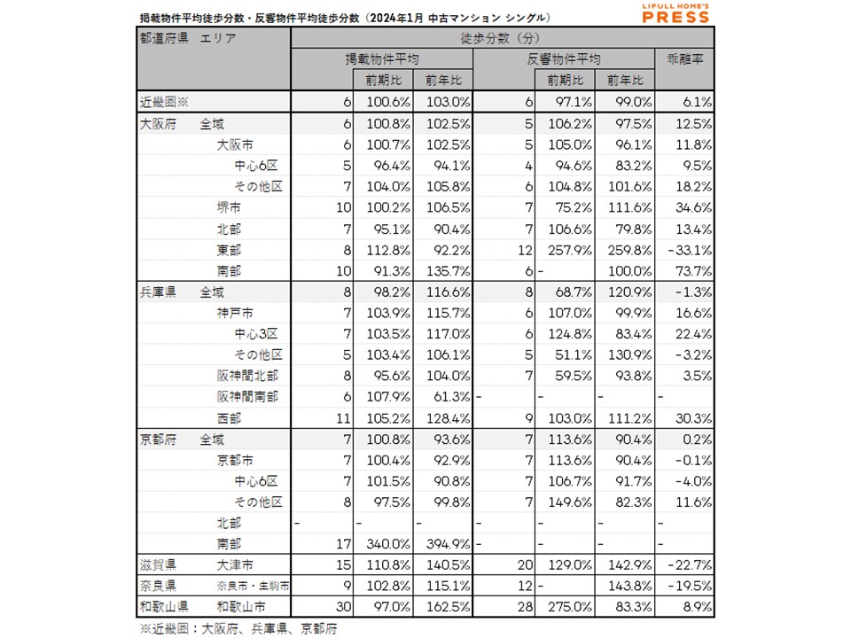 2024年1月の近畿圏シングル向き中古マンションの掲載物件平均徒歩分数および反響物件平均徒歩分数は以下の通り。