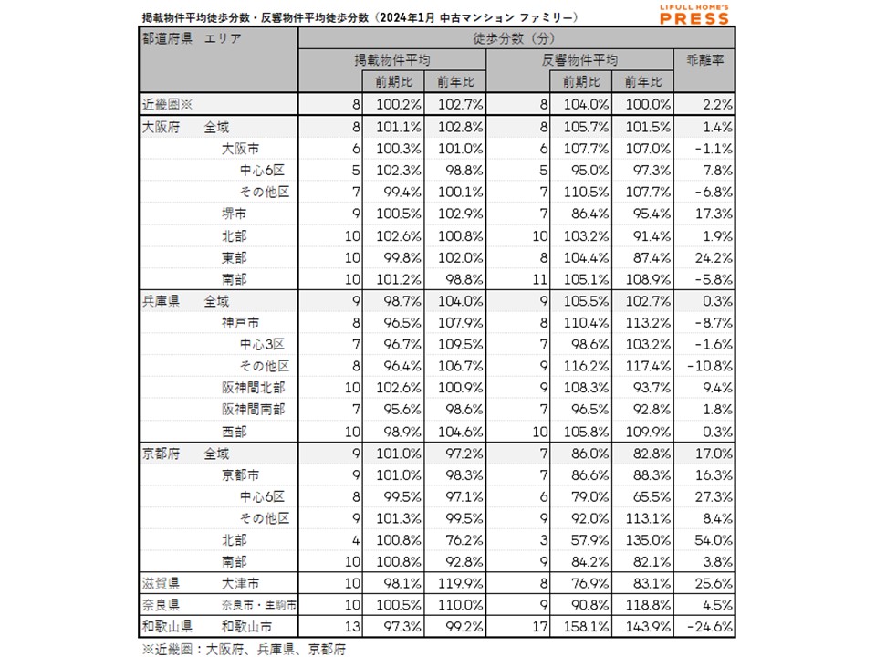 2024年1月の近畿圏ファミリー向き中古マンションの掲載物件平均徒歩分数および反響物件平均徒歩分数は以下の通り。