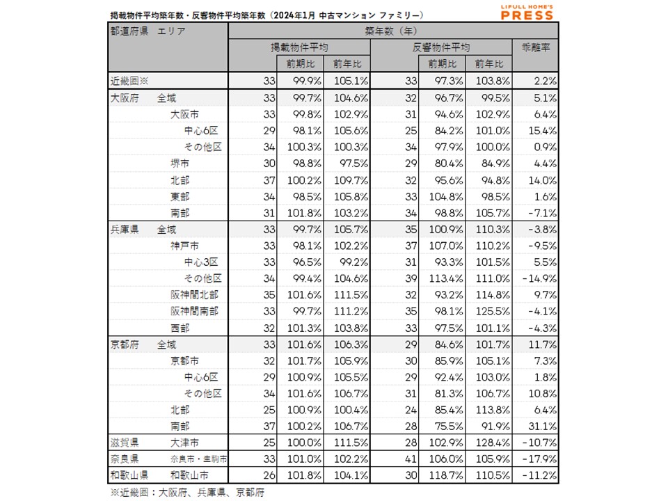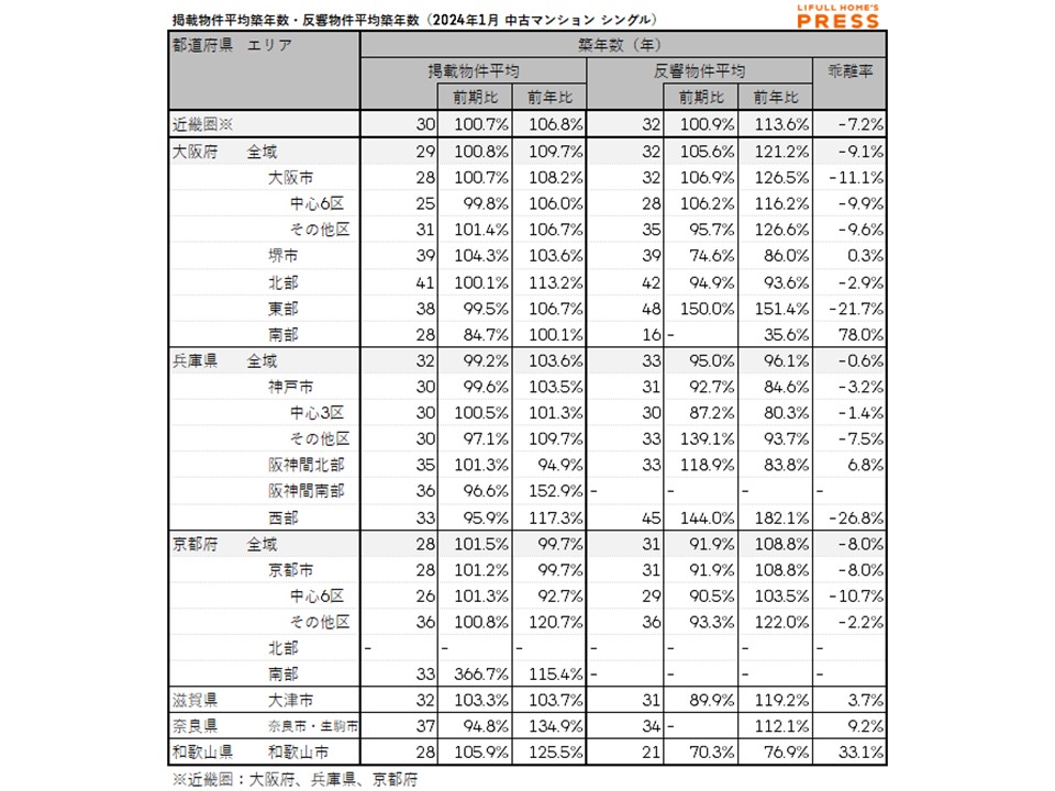 2024年1月の近畿圏ファミリー向き中古マンションの掲載物件平均築年数および反響物件平均築年数は以下の通り。
