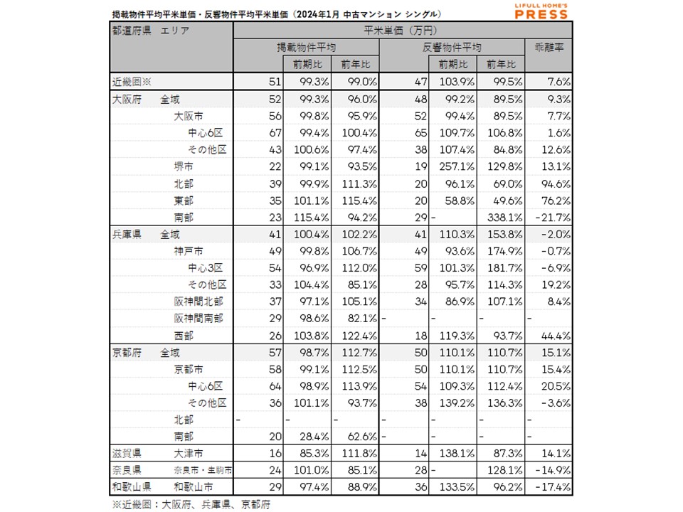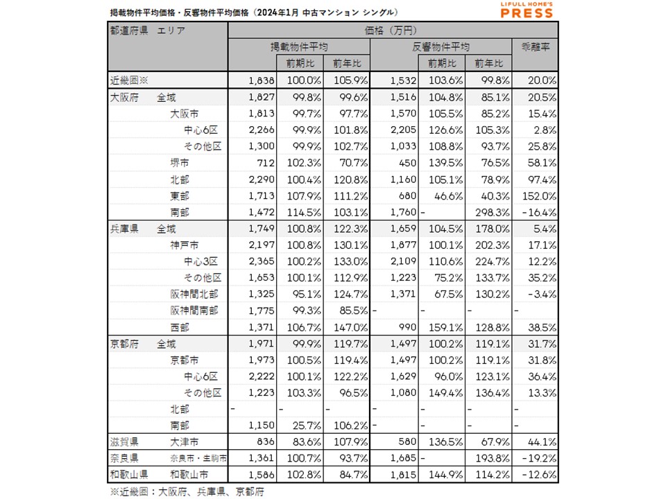 2024年1月の近畿圏シングル向き中古マンションの掲載物件平均価格および反響物件平均価格は以下の通り。
