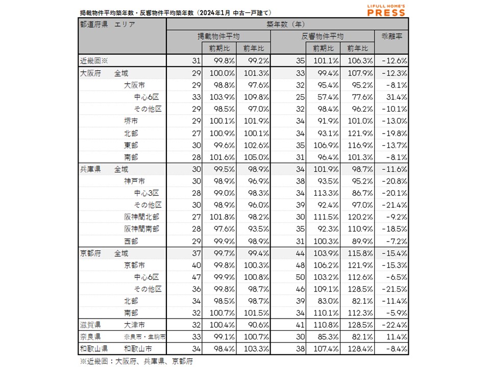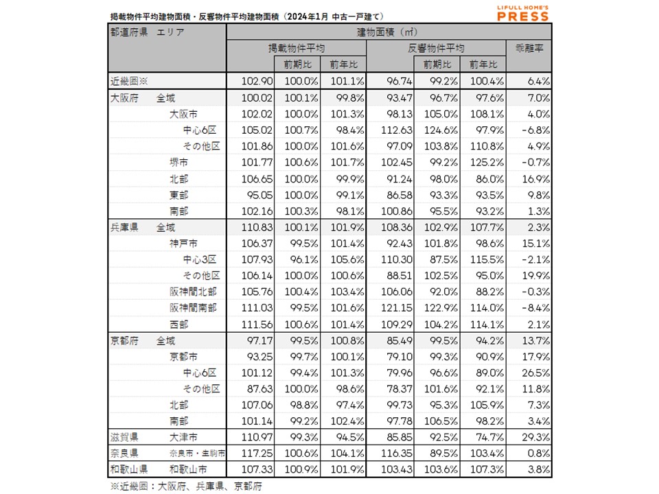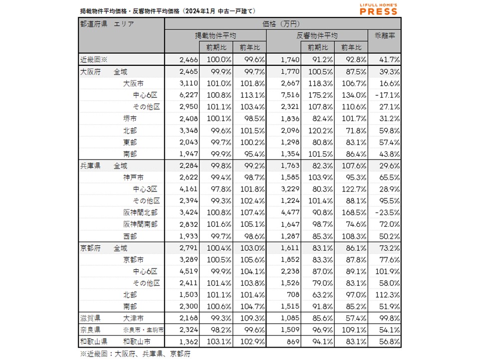 2024年1月の近畿圏中古一戸建ての掲載物件平均価格および反響物件平均価格は以下の通り。