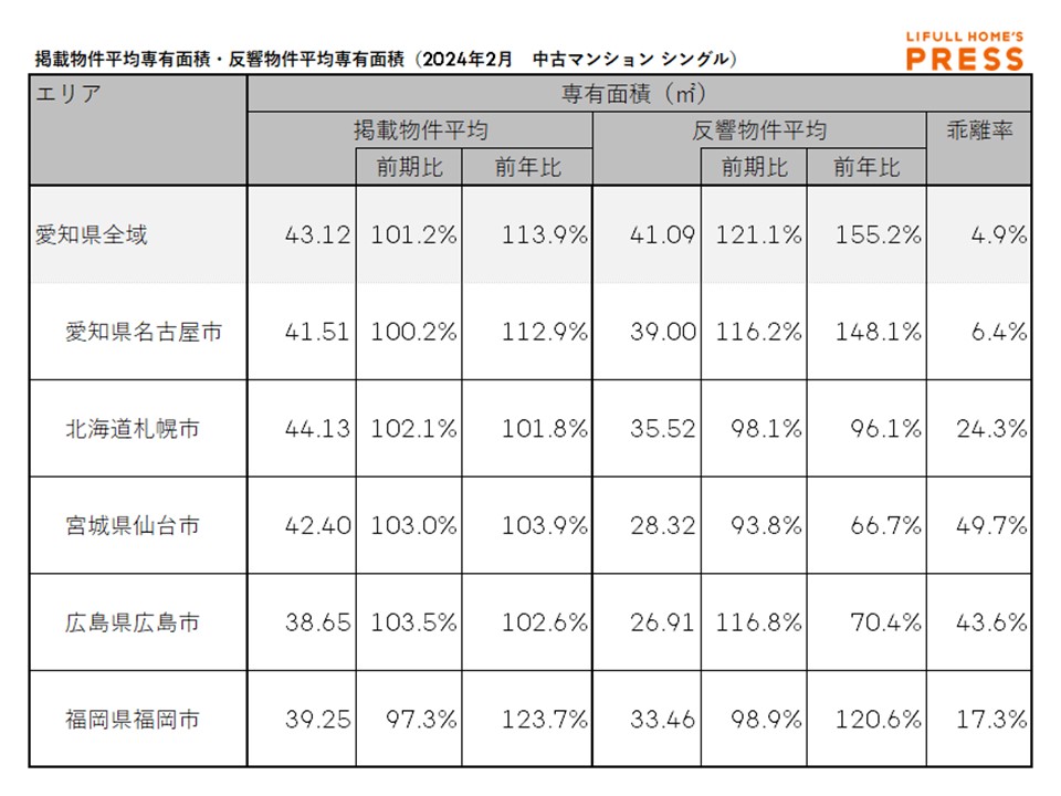2024年2月の愛知県および地方4市(札幌市、仙台市、広島市、福岡市)のシングル向き中古マンションの掲載物件平均専有面積および反響物件平均専有面積は以下の通り。