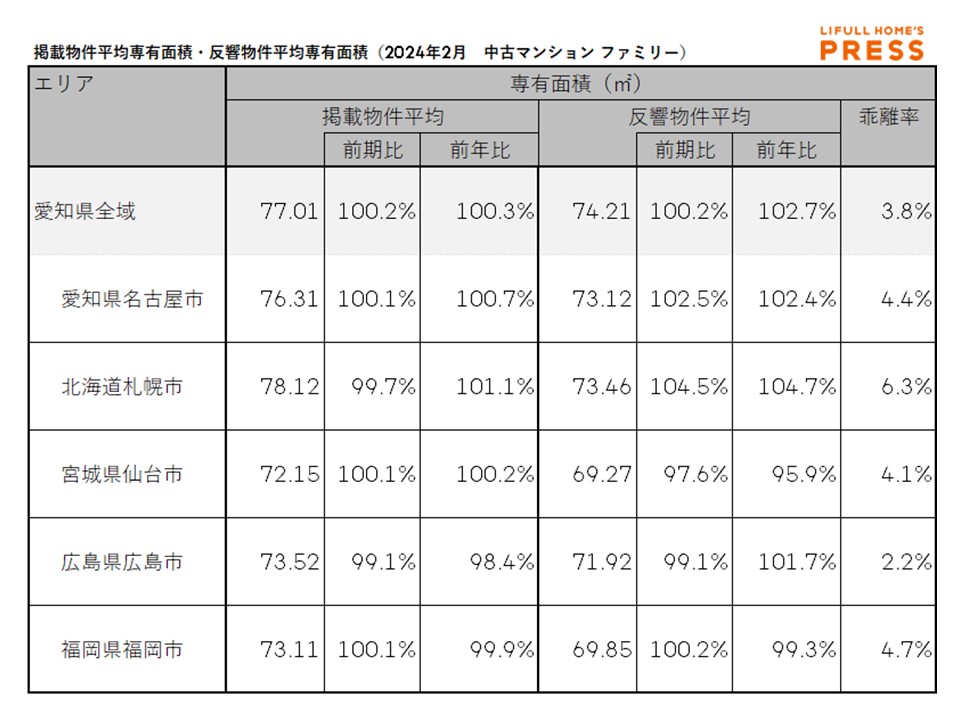 2024年2月の愛知県および地方4市(札幌市、仙台市、広島市、福岡市)のファミリー向き中古マンションの掲載物件平均専有面積および反響物件平均専有面積は以下の通り。