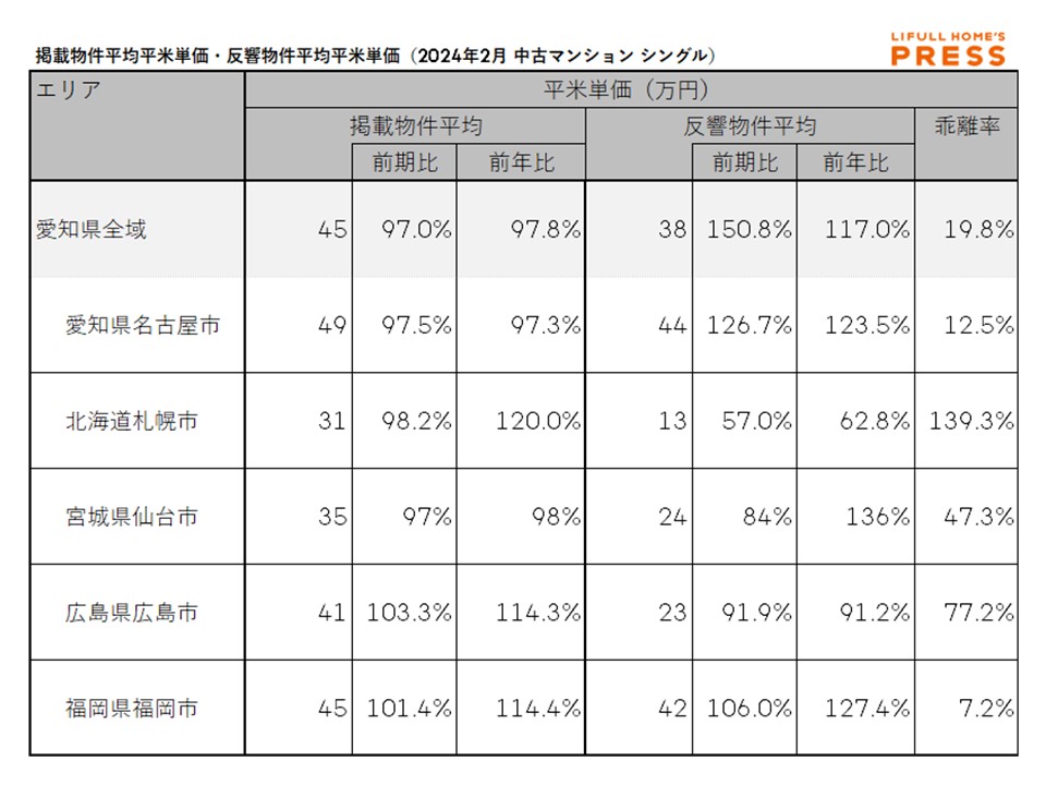 2024年2月の愛知県および地方4市(札幌市、仙台市、広島市、福岡市)のシングル向き中古マンションの掲載物件平均価格および反響物件平均価格は以下の通り。