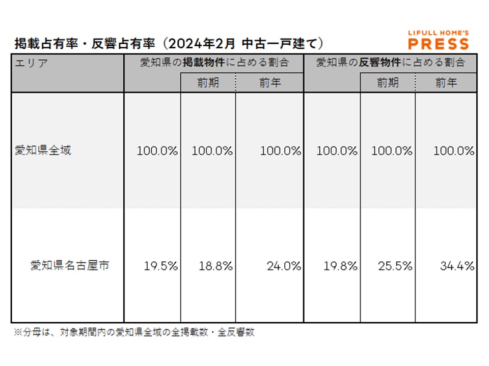 2024年2月の愛知県および地方4市(札幌市、仙台市、広島市、福岡市)の中古一戸建ての掲載物件平均価格および反響物件平均価格は以下の通り。