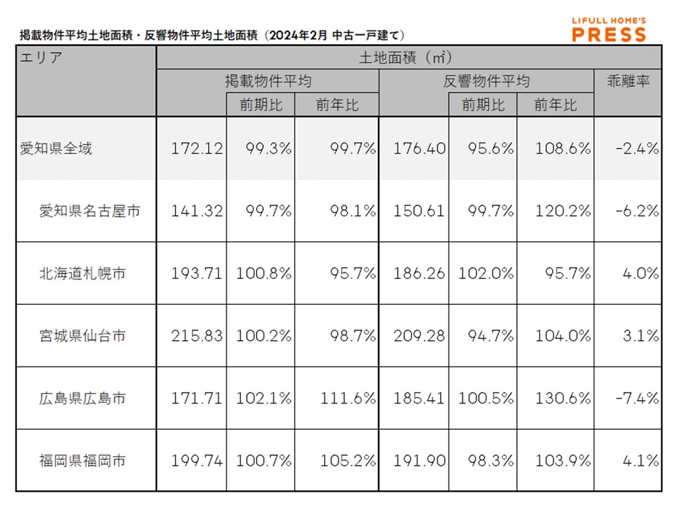 2024年2月期の愛知県および地方4市(札幌市、仙台市、広島市、福岡市)の中古一戸建ての掲載物件土地建物面積および反響物件平均土地面積は以下の通り。