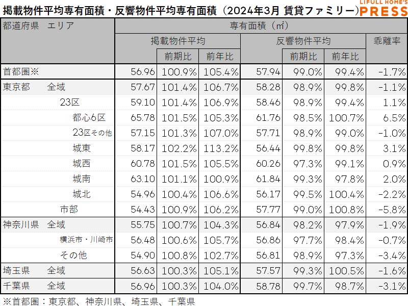 2024年3月の首都圏ファミリー向き賃貸物件の掲載物件平均賃料および反響物件平均賃料は以下の通り。