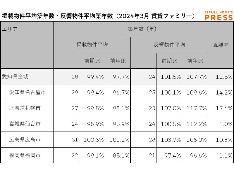 2024年3月の愛知県および地方4市(札幌市、仙台市、広島市、福岡市)のファミリー向き賃貸物件の掲載物件平均築年数および反響物件平均築年数は以下の通り。