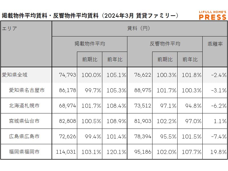 2024年3月の愛知県および地方4市(札幌市、仙台市、広島市、福岡市)のファミリー向き賃貸物件の掲載物件平均賃料および反響物件平均賃料は以下の通り。