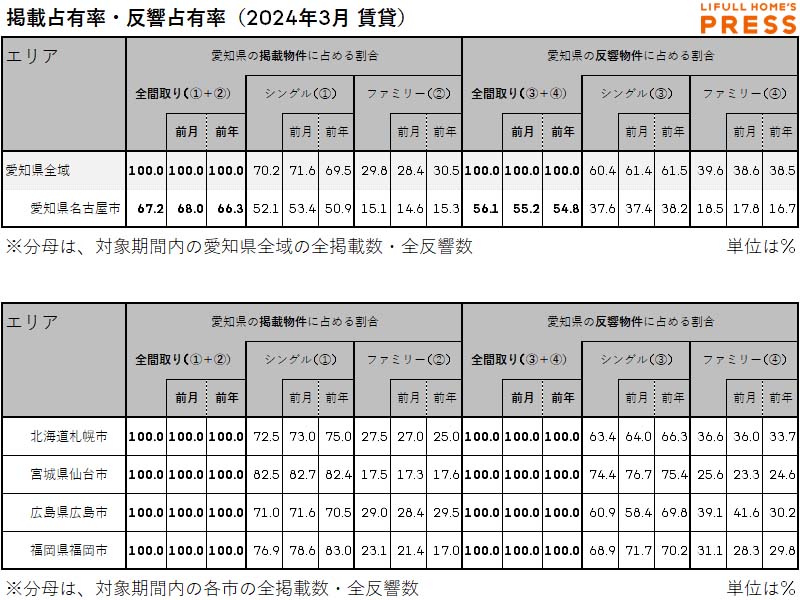 2024年3月の愛知県および地方4市(札幌市、仙台市、広島市、福岡市)賃貸物件市場における、各エリアの掲載占有率および反響占有率は以下の通り。
