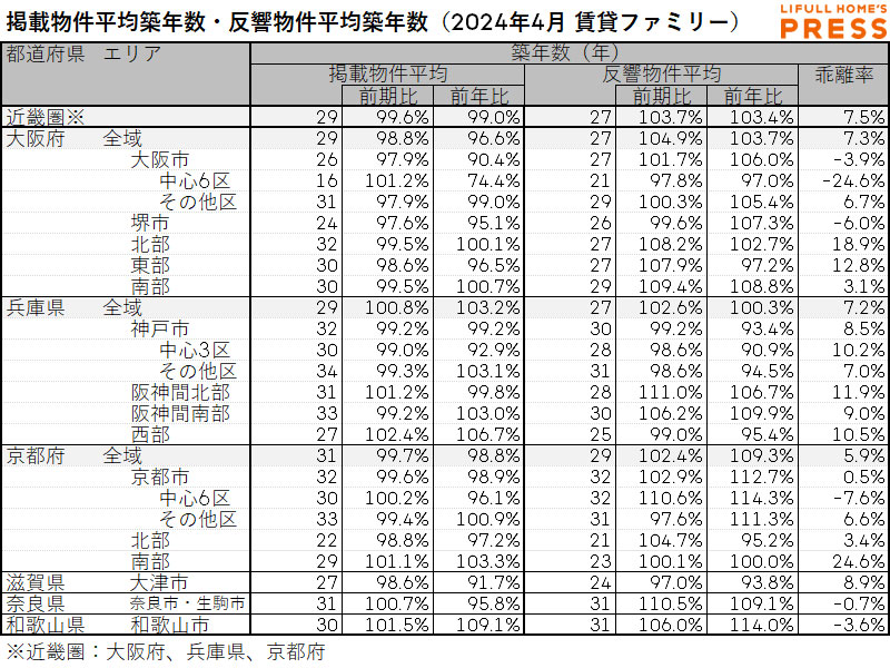 2024年4月の近畿圏ファミリー向き賃貸物件の掲載物件平均賃料および反響物件平均賃料は以下の通り。