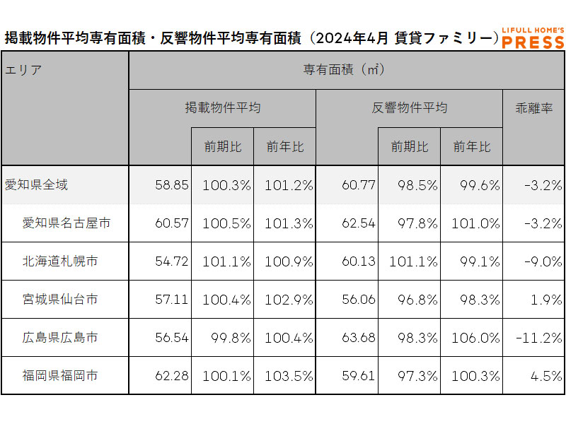 2024年4月の愛知県および地方4市(札幌市、仙台市、広島市、福岡市)のファミリー向き賃貸物件の掲載物件平均専有面積および反響物件平均専有面積は以下の通り。