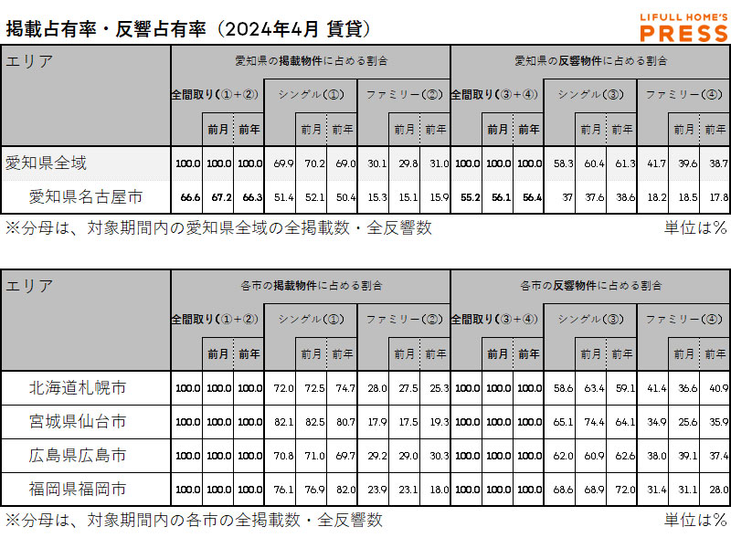 2024年4月の愛知県および地方4市(札幌市、仙台市、広島市、福岡市)賃貸物件市場における、各エリアの掲載占有率および反響占有率は以下の通り。
