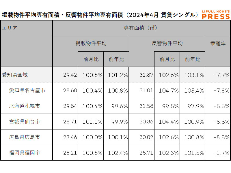 2024年4月の愛知県および地方4市(札幌市、仙台市、広島市、福岡市)のシングル向き賃貸物件の掲載物件平均専有面積および反響物件平均専有面積は以下の通り。