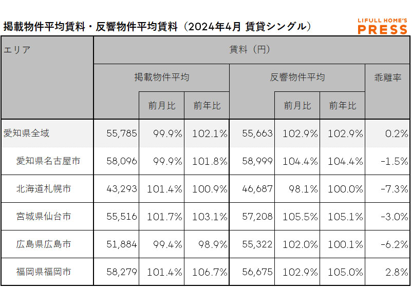 2024年4月の愛知県および地方4市(札幌市、仙台市、広島市、福岡市)のシングル向き賃貸物件の掲載物件平均賃料および反響物件平均賃料は以下の通り。