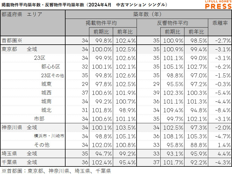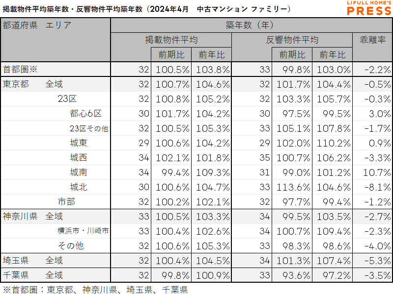 2024年4月の首都圏ファミリー向き中古マンションの掲載物件平均築年数および反響物件平均築年数は以下の通り。