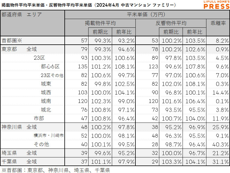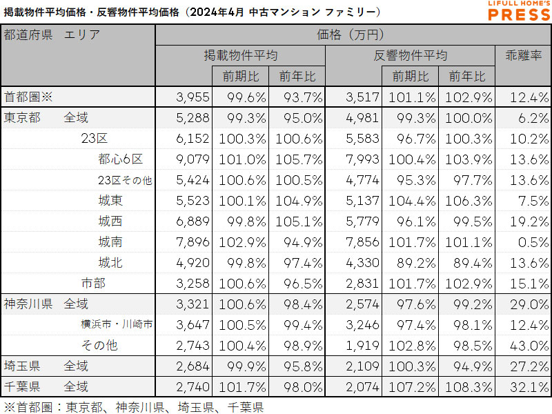2024年4月の首都圏ファミリー向き中古マンションの掲載物件平均価格および反響物件平均価格は以下の通り。