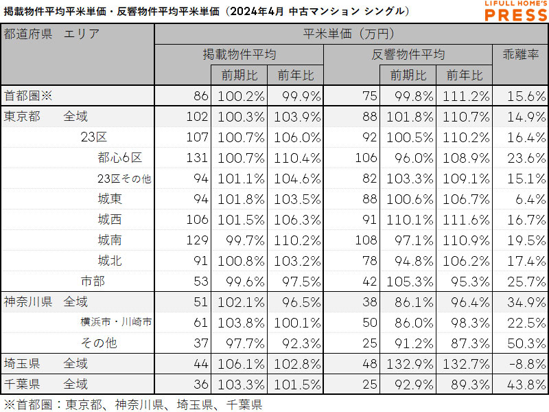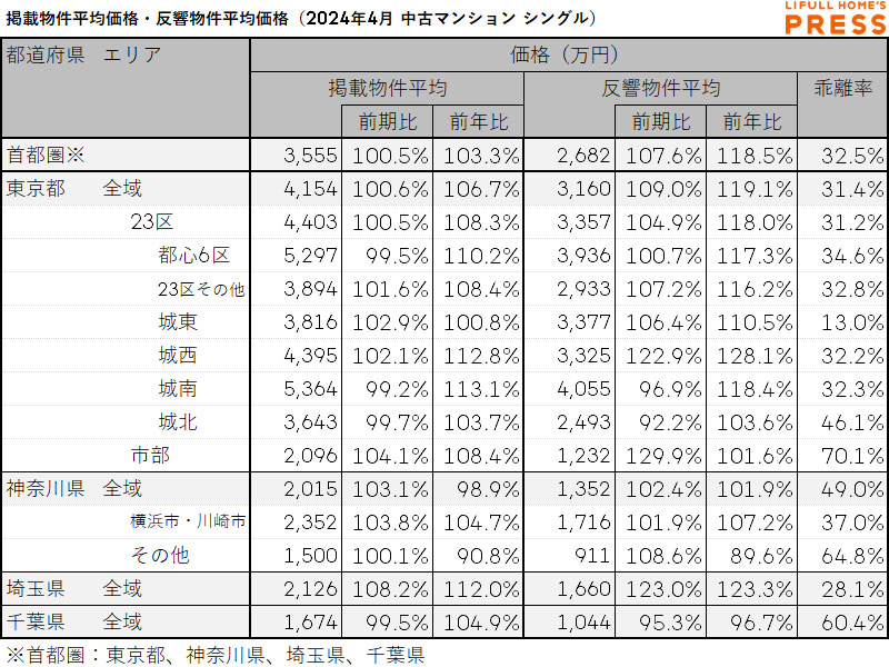 2024年4月の首都圏シングル向き中古マンションの掲載物件平均価格および反響物件平均価格は以下の通り。
