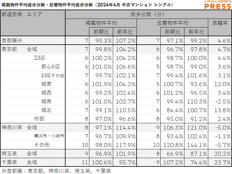 2024年4月の首都圏シングル向き中古マンションの掲載物件平均徒歩分数および反響物件平均徒歩分数は以下の通り。