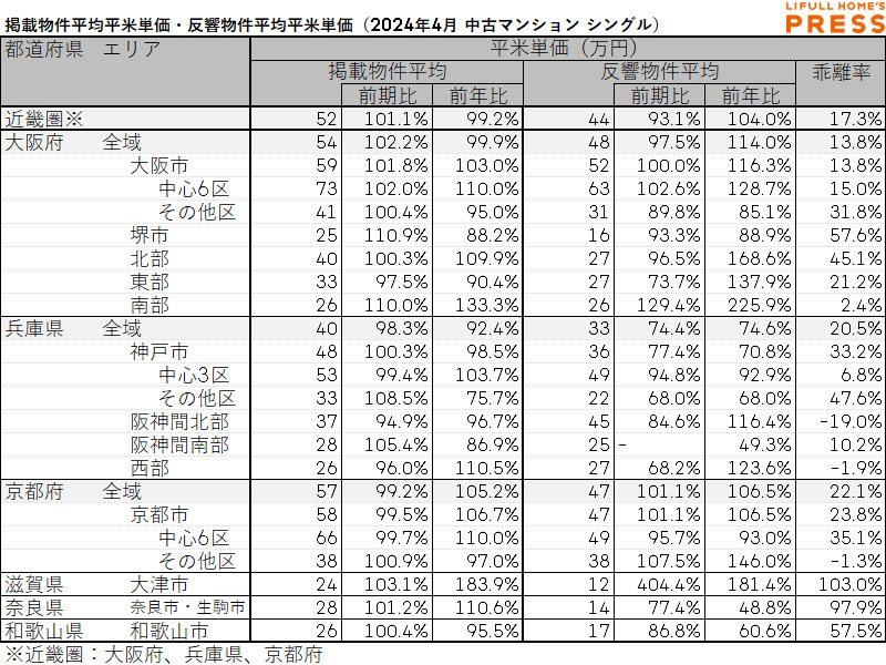 2024年4月の近畿圏シングル向き中古マンションの掲載物件平均価格および反響物件平均価格は以下の通り。