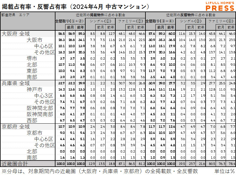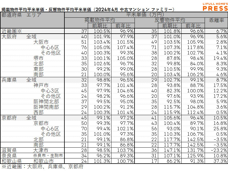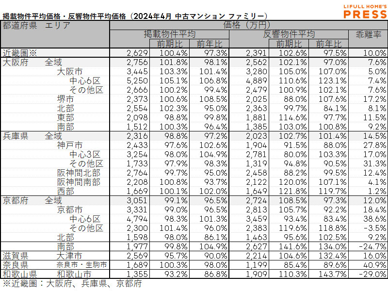2024年4月の近畿圏ファミリー向き中古マンションの掲載物件平均価格および反響物件平均価格は以下の通り。