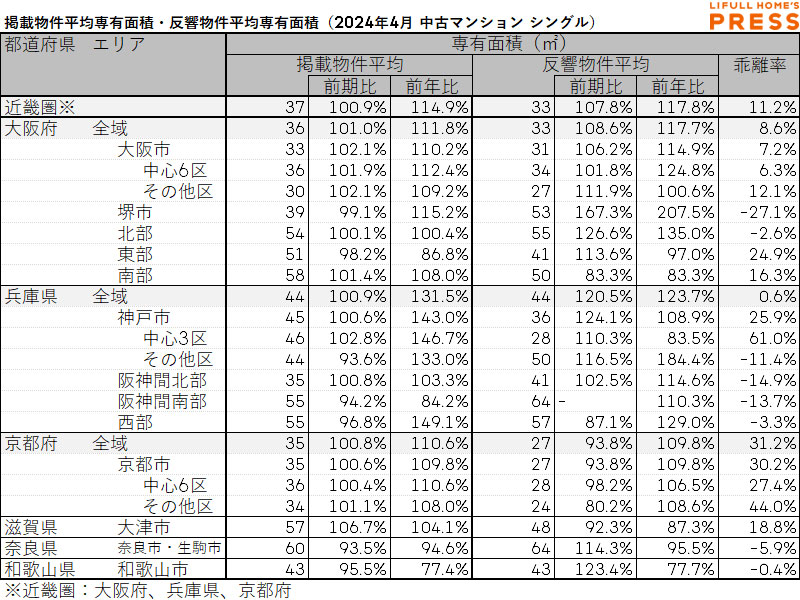 2024年4月の近畿圏シングル向き中古マンションの掲載物件平均専有面積および反響物件平均専有面積は以下の通り。
