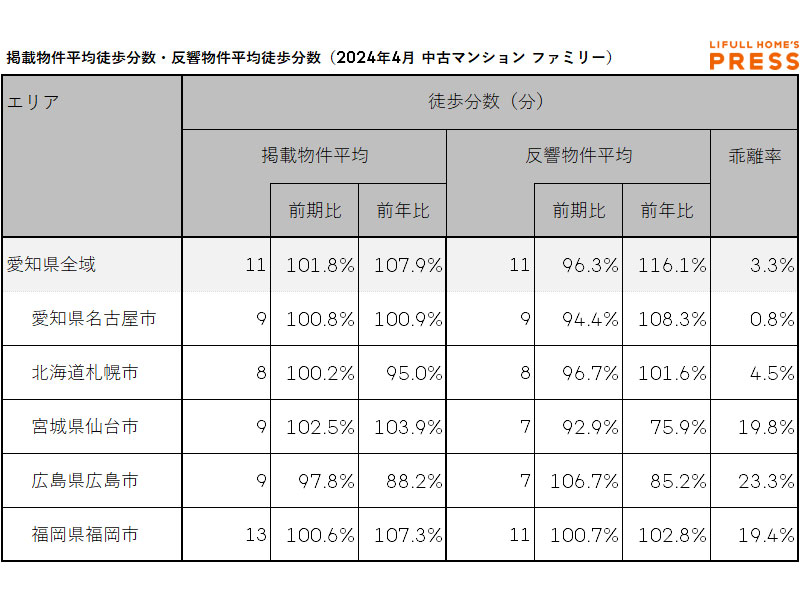 2024年4月の愛知県および地方4市(札幌市、仙台市、広島市、福岡市)のシングル向き中古マンションの掲載物件平均徒歩分数および反響物件平均徒歩分数は以下の通り。
