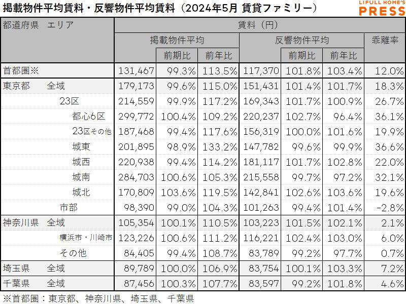 2024年5月の首都圏ファミリー向き賃貸物件の掲載物件平均賃料および反響物件平均賃料は以下の通り。