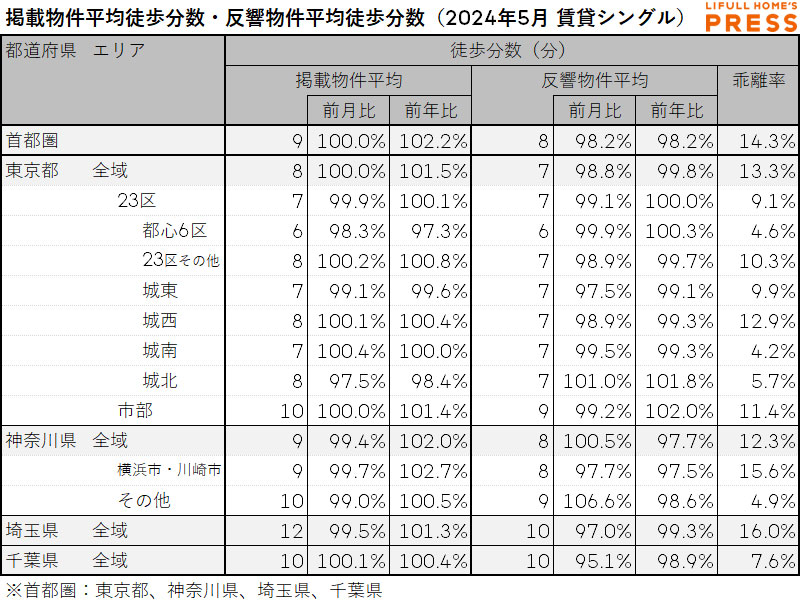 2024年5月の首都圏シングル向き賃貸物件の掲載物件平均徒歩分数および反響物件平均徒歩分数は以下の通り。