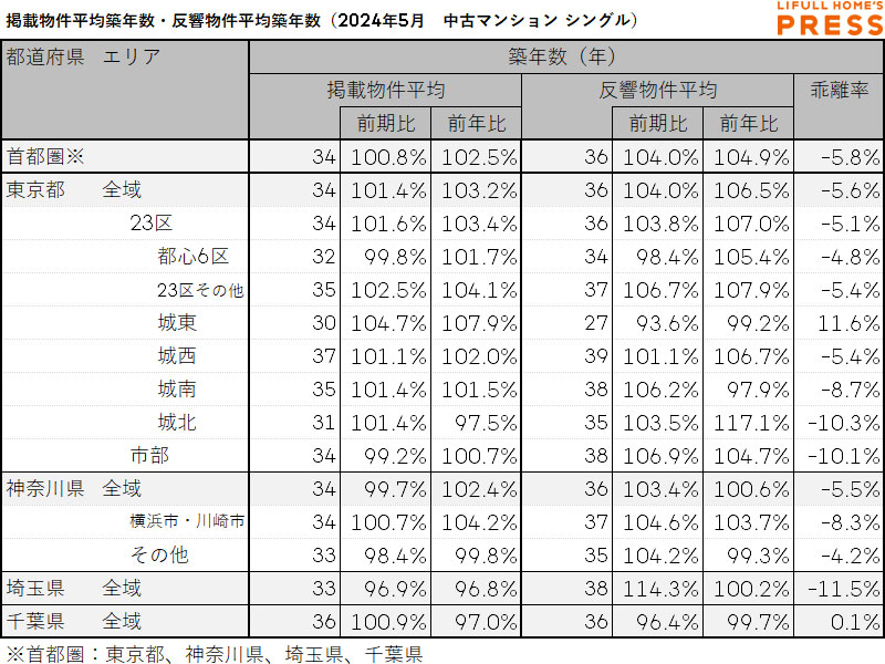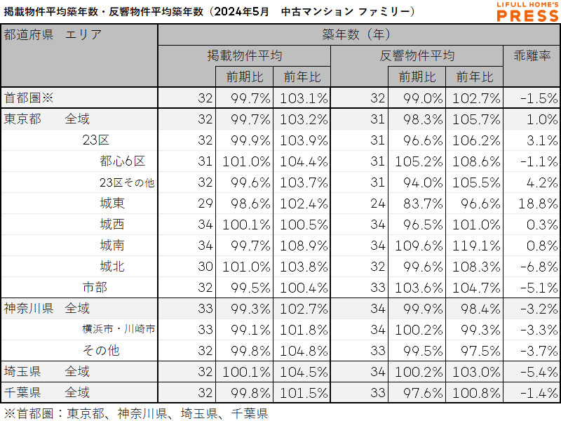 2024年5月の首都圏ファミリー向き中古マンションの掲載物件平均築年数および反響物件平均築年数は以下の通り。