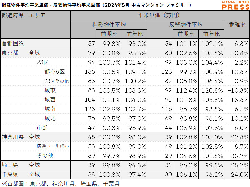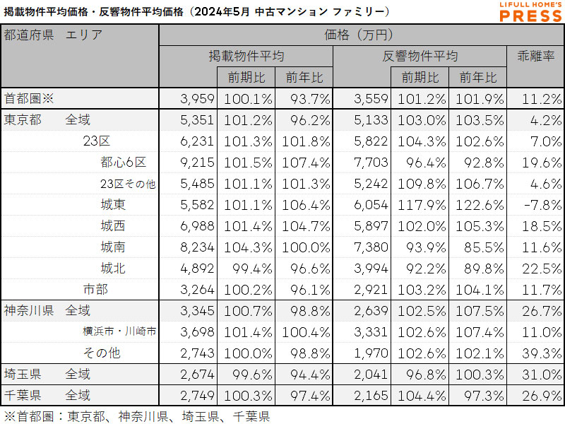 2024年5月の首都圏ファミリー向き中古マンションの掲載物件平均価格および反響物件平均価格は以下の通り。