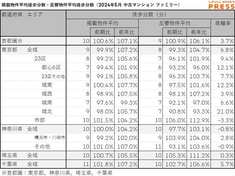 2024年5月の首都圏ファミリー向き中古マンションの掲載物件平均徒歩分数および反響物件平均徒歩分数は以下の通り。