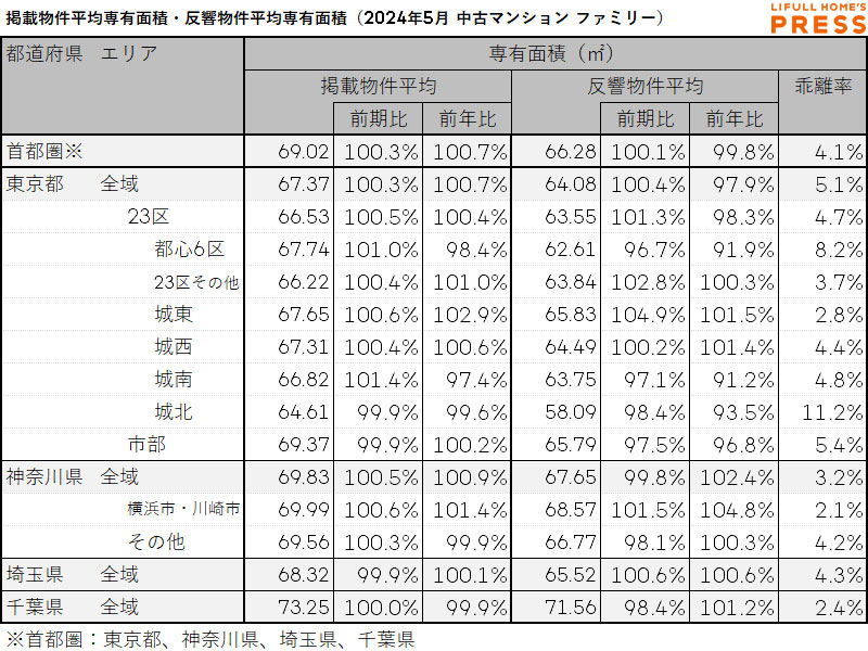 2024年5月の首都圏ファミリー向き中古マンションの掲載物件平均専有面積および反響物件平均専有面積は以下の通り。