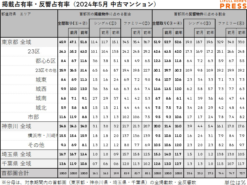 LIFULL HOME'Sマーケットレポートとは、LIFULL HOME'Sで掲載された物件データおよびユーザーがLIFULL HOME'Sを介して不動産会社に問合せた物件データをマーケットごとに公開するものである。本稿では、2024年5月に登録・公開された首都圏の中古マンションにおける以下のデータをまとめた。