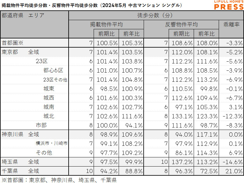 2024年5月の首都圏シングル向き中古マンションの掲載物件平均徒歩分数および反響物件平均徒歩分数は以下の通り。
