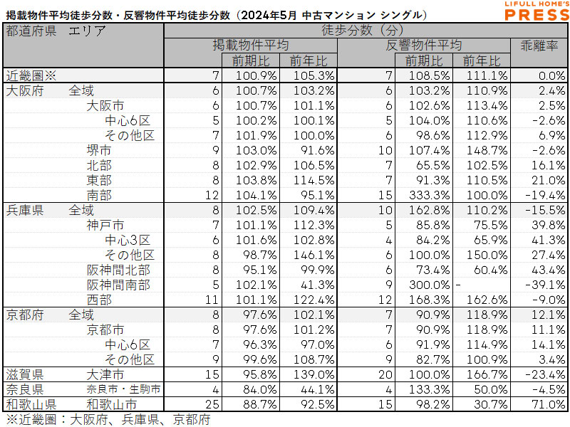 2024年5月の近畿圏ファミリー向き中古マンションの掲載物件平均徒歩分数および反響物件平均徒歩分数は以下の通り。