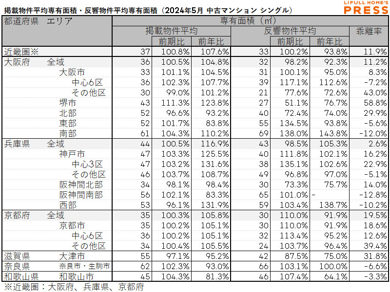 2024年5月の近畿圏シングル向き中古マンションの掲載物件平均専有面積および反響物件平均専有面積は以下の通り。