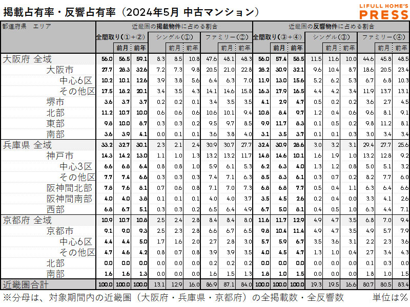 2024年5月の近畿圏ファミリー向き中古マンションの掲載物件平均価格および反響物件平均価格は以下の通り。
