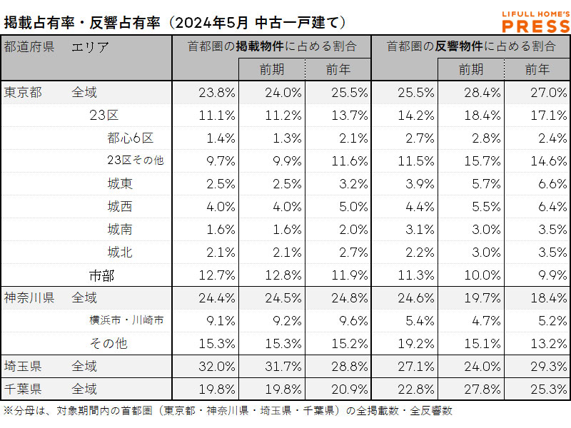 2024年5月の首都圏中古一戸建ての掲載物件平均価格および反響物件平均価格は以下の通り。