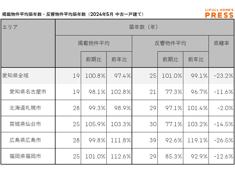 2024年5月の愛知県および地方4市(札幌市、仙台市、広島市、福岡市)の中古一戸建ての掲載物件平均築年数および反響物件平均築年数は以下の通り。