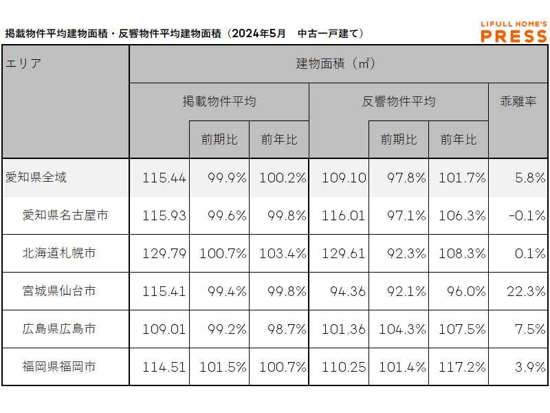 2024年5月の愛知県および地方4市(札幌市、仙台市、広島市、福岡市)の中古一戸建ての掲載物件平均建物面積および反響物件平均建物面積は以下の通り。