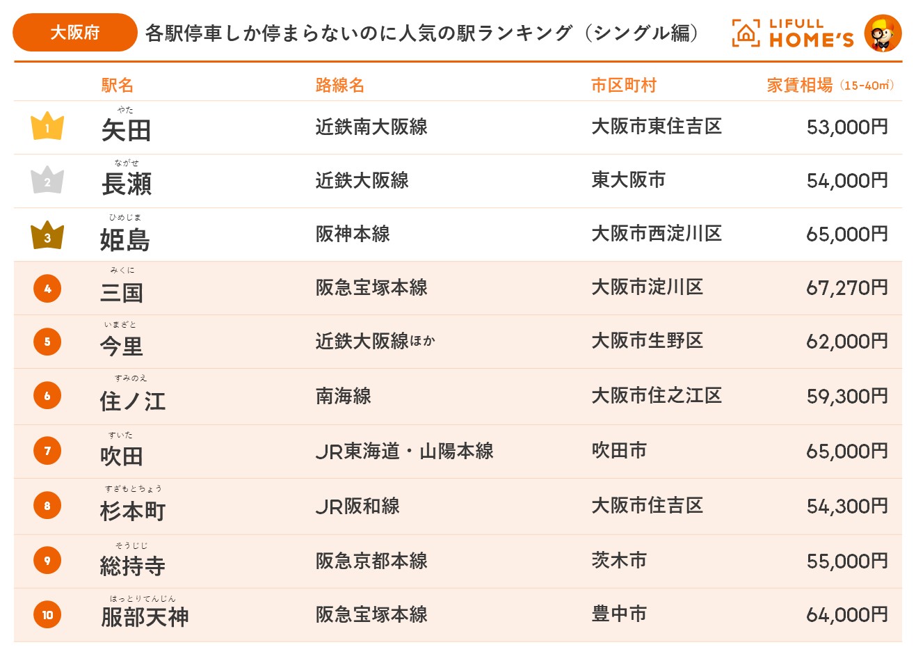 大阪府編は1位「矢田」、2位「長瀬」、3位「姫島」となり、さまざまなエリア・路線の駅が並んだ。