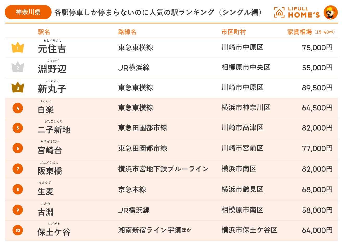 神奈川県編は1位「元住吉」、2位「淵野辺」、3位「新丸子」となり、トップ10のうち5駅が東急線沿線の駅となった。