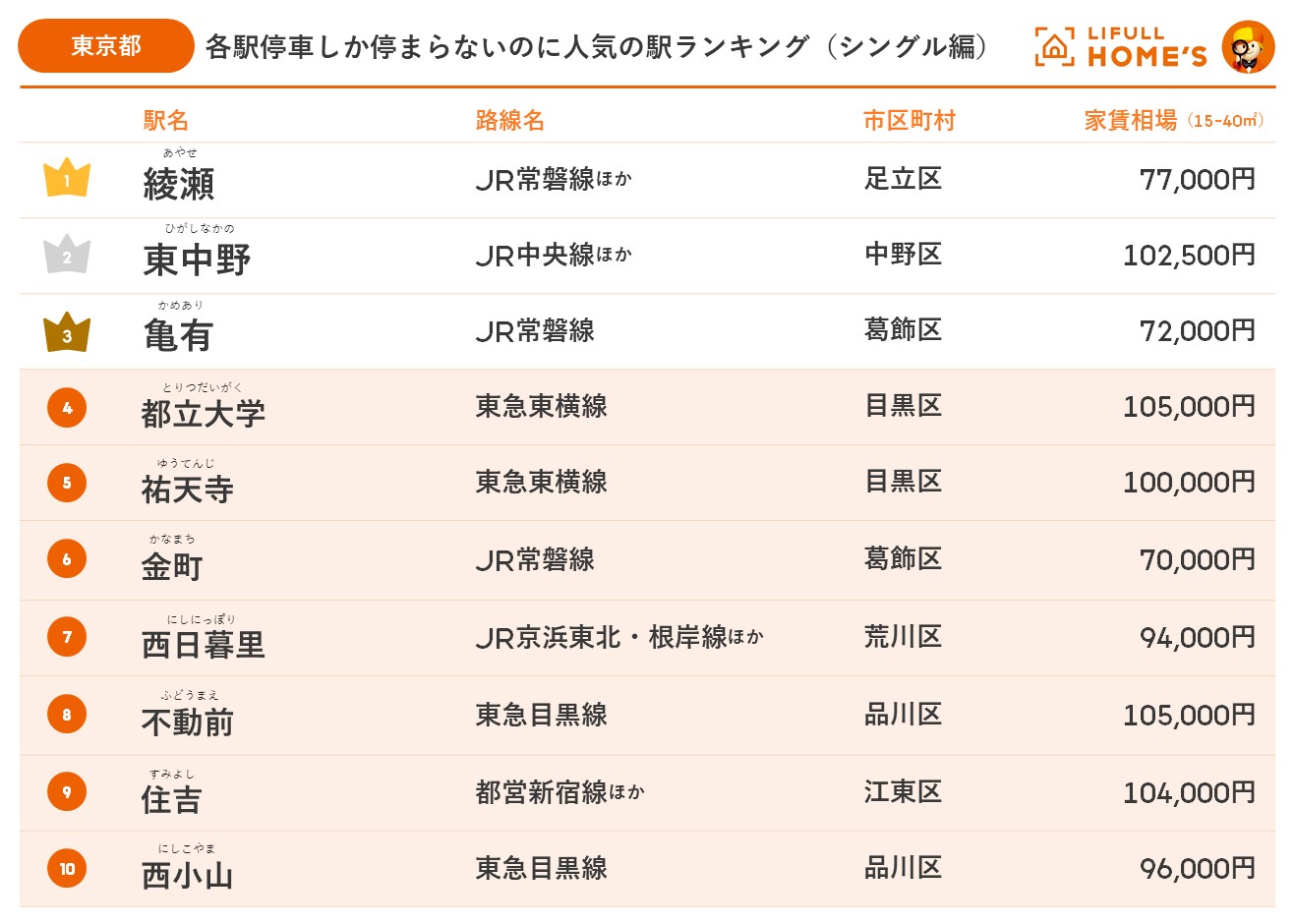東京都編では1位「綾瀬」、2位「東中野」、3位「亀有」となり、トップ10内にはさまざまなエリア・路線の駅が入った。